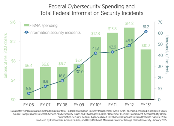 This week’s charts use data from the Congressional Research Serviceand the Government Accountability Office to display total federal cybersecurity spending required by the Federal Information Security Management Act of 2002 (FISMA) with the total number of reported information security incidents of federal systems from 2006 to 2013. The first chart shows that the number of federal cybersecurity failures has increased every year since 2006, even as investments in cybersecurity processes and systems have increased considerably.