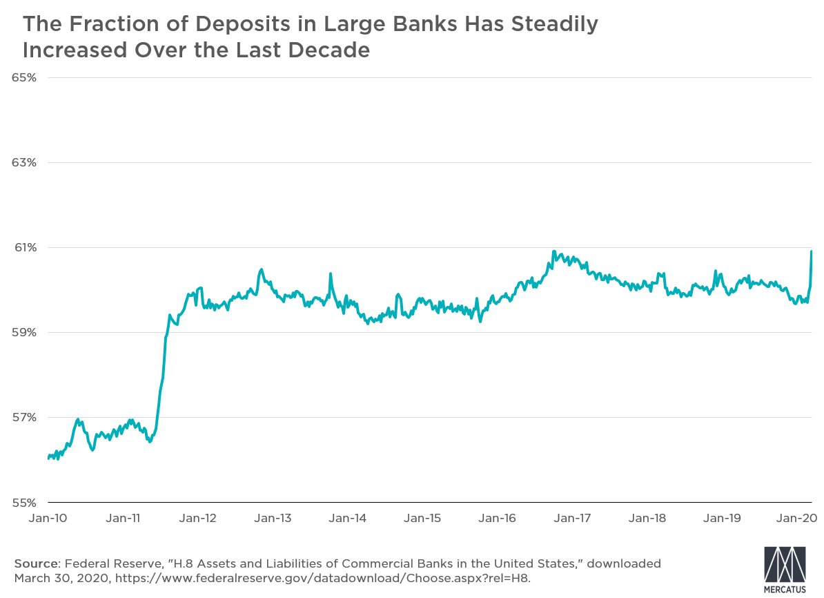 Assuming that the government will support the largest banks is the safe choice for individuals to make, and this will become more so if the crisis is prolonged. While deposits at both large and small banks are guaranteed up to $250,000, the largest banks have an additional implied 100 percent guarantee for deposits and other liabilities. The federal government and Federal Reserve’s liquidity programs apply most directly to the largest banks. The implied guarantee and other support programs demonstrate just how deeply entrenched the too-big-to-fail doctrine (TBTF) is for the larger US banks, providing them a distinct advantage over their smaller rivals.