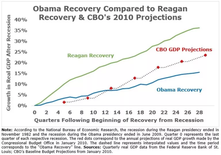 Economic growth after the Great Recession has been anemic by historical standards and relative to expectations. Annual real GDP increased just 2.1% during this most recent recovery, 50% below the average growth rate predicted by CBO and less than half the growth rate during the Reagan recovery. The weak economic recovery has produced lower health care spending, and thus lower health insurance premiums, than would have resulted with a stronger recovery.