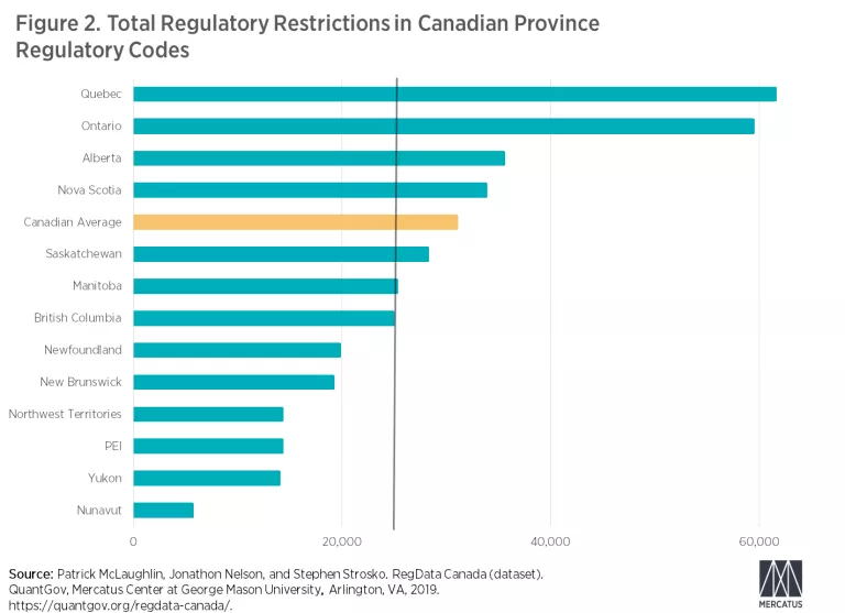 The average provincial regulatory and statutory codes are significantly smaller than the federal codes. The average provincial regulatory code contains about 2 million words and 20,000 restrictions, and the average statutory code contains about 2.9 million words and 31,000 restrictions. See the charts below for the restriction counts from each provincial regulatory and statutory code. The vertical line shows median restriction count.