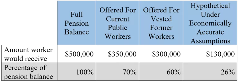 Without fully explaining how the lump-sums are calculated, or which interest rates are used, policymakers are concealing the fact that beneficiaries would receive more than what the state can afford. Suppose I used to be a public worker, but have since retired from service. Let’s also assume that my pension balance is $500,000. Under the bill that just passed, I could choose to receive 60 percent of my balance, or $300,000, as a lump-sum. As previously explained, however, this estimate relies on unrealistic interest rate assumptions.