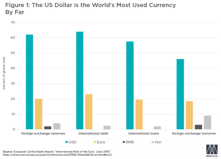 The dollar’s dominance is evidenced by the 50 to 80 percent of international trade being invoiced in dollars, the $28 trillion of relatively liquid, dollar-denominated debt held outside the United States, and the 70 percent of the world economy’s currencies anchored in varying degrees to the dollar. Figure 1 provides further evidence of the dollar’s dominance by comparing it to other currencies across several indicators. The dollar truly is king among currencies.