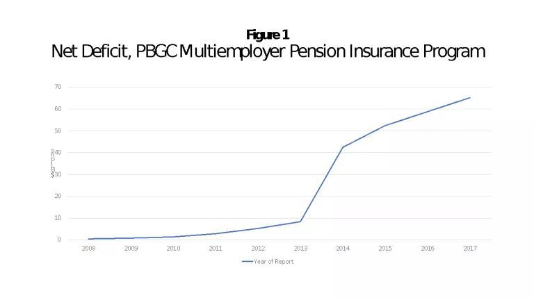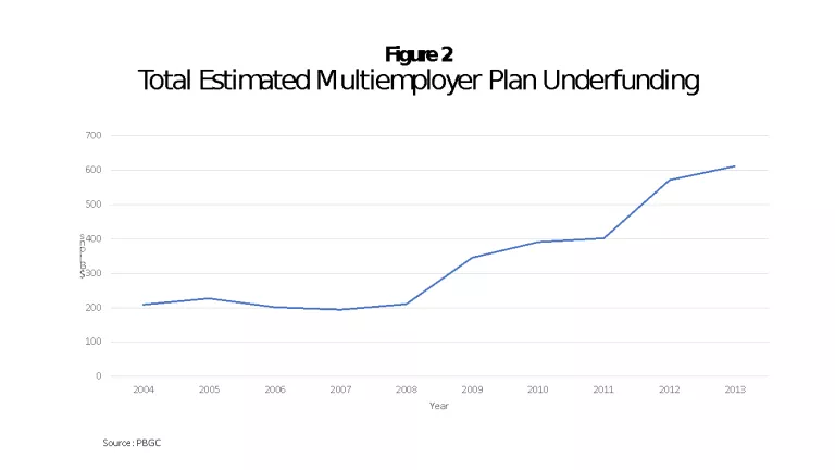 Another important lesson of Figure 1 is that this is not a problem that will fix itself if the economy just gets a boost. While the great recession of 2007-09 took its toll on pension funding, the multiemployer program entered its current dire straits sometime between the 2013 and 2014 annual PBGC reports, largely due to two very large multiemployer plans entering probable termination status. Even a recently booming stock market has not put these plans on sound footing, and there is little realistic prospect of financial stabilization without substantial changes to both future pension payments and employer contribution requirements. As PBGC director Tom Reederrecently testified, these plans are in trouble because “the ratio of active to inactive (retired) participants is at its lowest point ever” (a situation that will only grow worse) and because many of these plans increased benefits during the 1990s market bubble, to levels that could not be sustained after subsequent market corrections.
