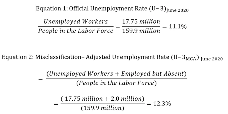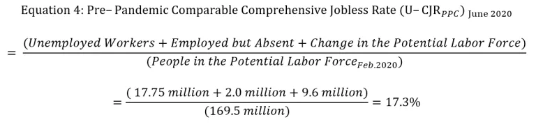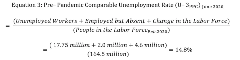 A pre-pandemic comparable unemployment rate would need to incorporate this sudden drop in the size of the labor force. I do this by counting all of the workers who “left” the labor force as unemployed, along with the officially unemployed workers and the misclassified “employed but absent” workers, and then compare this sum with the pre-pandemic size of the labor force:
