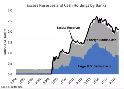 Most of the increased liabilities have been in the form of banks’ excess reserves. Banks deposit these at the Fed and earn the IOER payment. As seen in the figure below, almost all of the excess reserves parked at the Fed are cash holdings of foreign and large domestic banks.