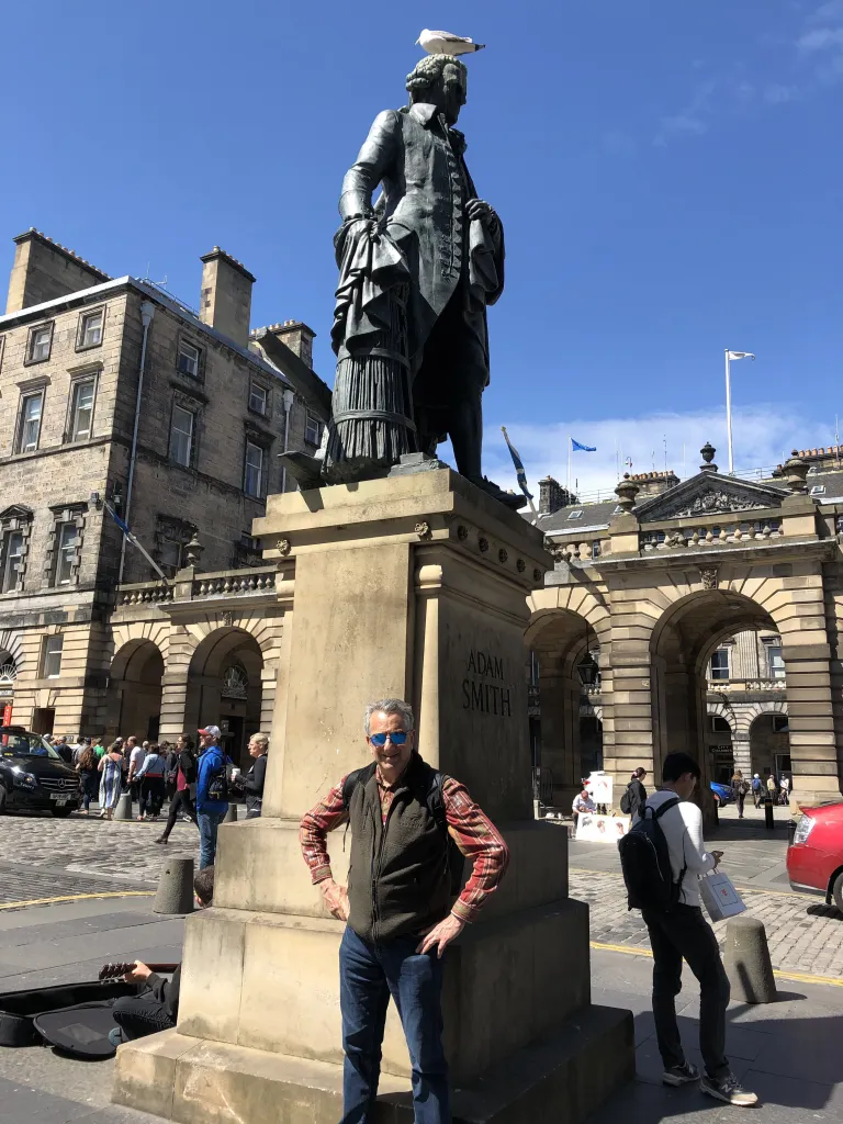 In Scotland, one can hardly swing a haggis over one’s head, it seems, without striking an image of Adam Smith. Adjacent is Patric Parc’s 1845 bust of Smith and the author of this article in the magnificent Kelvingrove Art Gallery and Museum in Glasgow. In this candid photo, my profile and Smith’s bear some mutual resemblance, though my garb (tartan plaid shirt and Harris tweed cap) is more Scottish than Smith’s Roman toga.