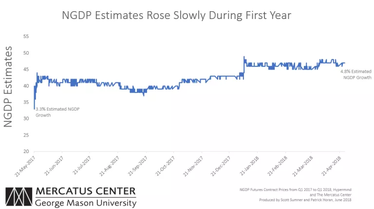 The market included two contests: the first (Year 1) measured NGDP growth from the first quarter of 2017 through the first quarter of 2018 and concluded in April. The second contest, which measures NGDP growth from the first quarter of 2018 through the first quarter of 2019, is ongoing and will be open to participants through next April.
