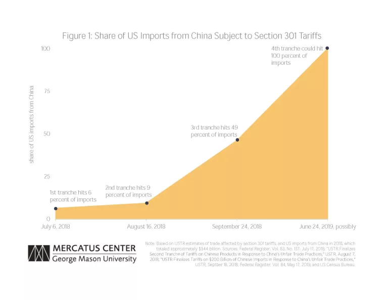 Note: Based on USTR estimates of trade affected by section 301 tariffs, and US imports from China in 2018, which totaled approximately $544 billion. Sources: Federal Register, Vol. 83, No. 137, July 17, 2018: "USTR Finalizes Second Tranche of Tariffs on Chinese Products in Response to China's Unfair Trade Practices," USTR. August 7, 2018; "USTR Finalizes Tariffs on $200 Billion of Chinese Imports in Response to China's Unfair Trade Practices," USTR, September 18, 2018; Federal Register, Vol. 84, May 17, 2019, and US Census Bureau.