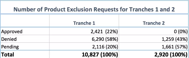 So far only the first two tranches have gone through the product exclusion request process and Table 1 reports the total number of requests and outcomes for those exclusion requests. The request process closed for tranche one in October 2018, and there were 10,827 exclusion requests. As of June 17, 2019, 2,421 were approved (22 percent), 6,290 were denied (58 percent), and 2,116 remain pending (20 percent). Tranche two closed in December 2018 and had 2,920 exclusion requests, of which none were approved, 1,259 (43 percent) denied, and 1,661 (57 percent) remain pending.