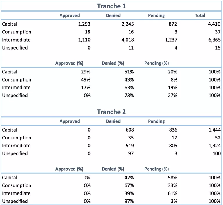 Table 4 reports the outcomes for product exclusion requests by broad economic category. For tranche one, consumer goods had the highest approval rate at 49 percent, compared to 29 percent for capital goods and 17 percent for intermediates. No product exclusions have been approved yet for tranche two, although 67 percent of the consumer goods requests have been denied thus far, along with 42 percent of capital goods and 39 percent of intermediates. The rest remain pending.