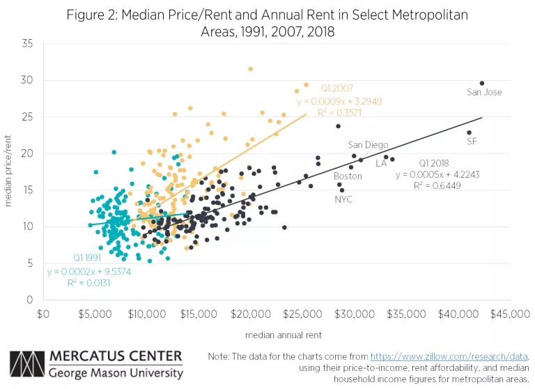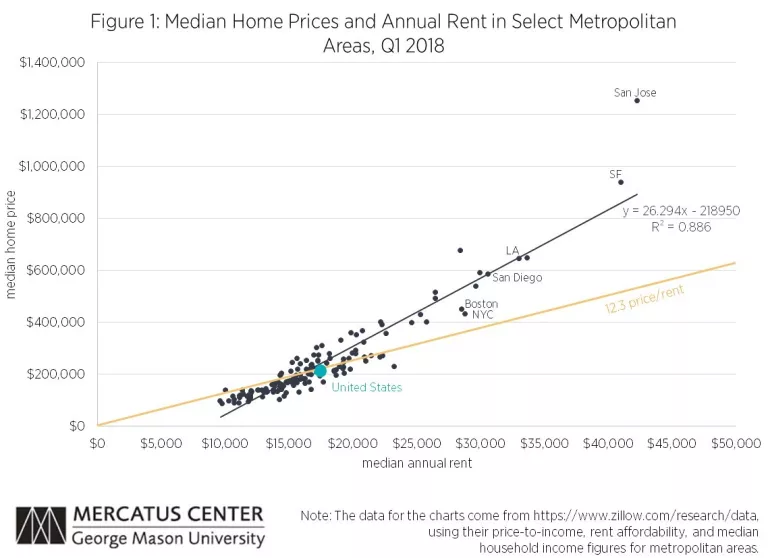 Confusion on this matter comes from the fact that when rents rise in a city, prices tend to rise even more. Figure 1 compares rents and prices among the largest metropolitan areas. The relationship between rent and price is extremely strong.