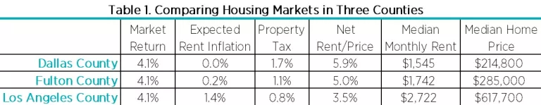 Let’s compare Dallas, Atlanta, and Los Angeles. We can estimate price, rent, and the rate of return on fixed income securities from market prices. Property tax rate estimates are also available. This leaves expected growth in rent as an unknown, which can be inferred from the other measures using the equation above. Estimates for each location are shown in Table 1.