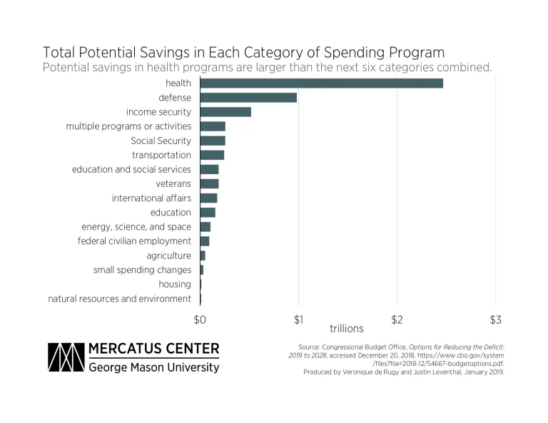 From the publication: "Looking at both mandatory and discretionary spending together, health and defense programs represent the largest of those programs the CBO identified for deficit reductions. Health programs alone represent $2.5 trillion in potential deficit reductions over the next decade. Defense spending represents nearly another trillion dollars of possible deficit reductions. Policymakers need to make a serious effort to constrain runaway budgets and debt. This CBO report is a good starting point.”