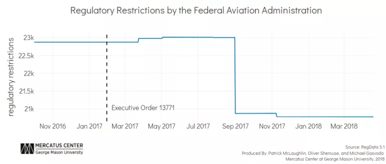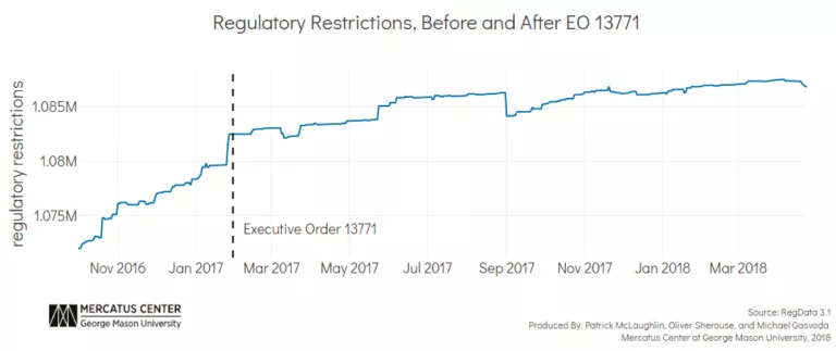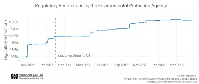 It is easy to see that the growth of regulation has decreased since the executive order was signed, but regulation as a whole is still accumulating. Of course, it’s worth mentioning that some regulatory agencies are exempt from the requirements of EO 13771.