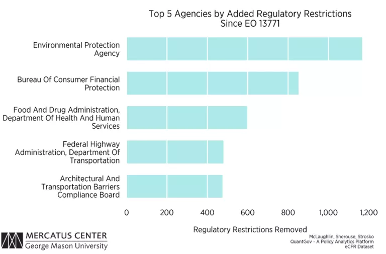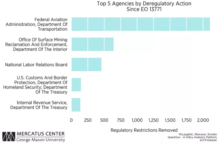 Using another dataset produced by the Mercatus Center at George Mason University called RegPulse, it is easy to pinpoint the individual agencies that may be behind this trend. The figure below shows the top five agencies with the largest regulatory reductions since January 30, 2017 when EO 13371 was signed.