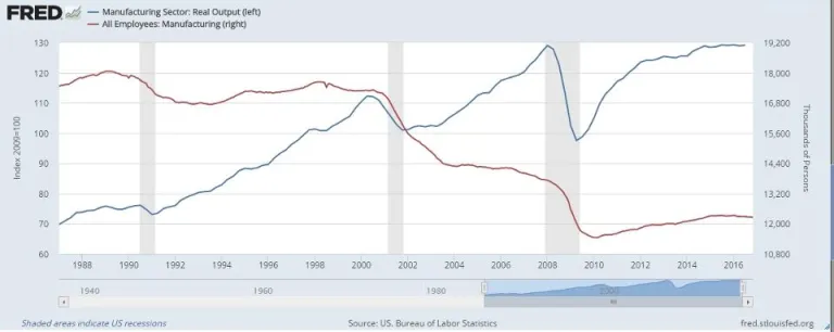 We must also remember that ultimately it is not international trade per se that causes some jobs to be destroyed, but progress. Advances in transportation drastically reduced the cost of overseas shipping, making trade with faraway places like China less costly. Other advances in technology have drastically increased the productivity of the average manufacturing worker, which means we need less workers to produce more stuff, as shown in the figure on the left. U.S. manufacturing output (blue line) is higher than ever despite fewer workers (red line).