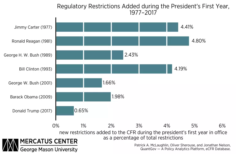 The chart below compares growth in regulatory restrictions during the first year of the last six administrations to President Trump's first year.