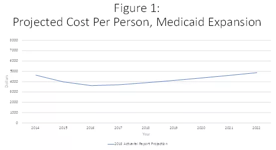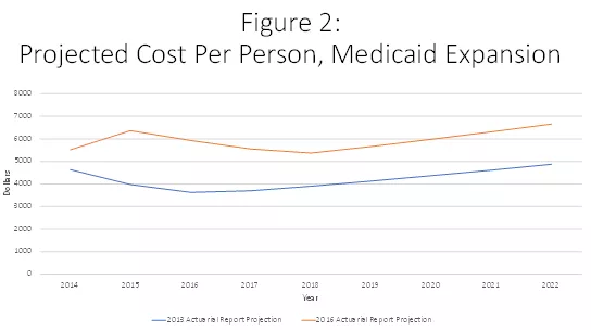 When the ACA first passed it was expected that the per capita cost of covering its Medicaid expansion population (childless adults under the age of 65 up to 138% of the federal poverty line) would be substantially less than for the adults under 65 who were already on Medicaid. This seemed a perfectly sensible prediction. After all, the already-eligible population included individuals (such as pregnant women) with substantial known health care needs. Accordingly, as seen in Figure 1, the 2013 Medicaid actuarial report projected that the cost of covering newly eligible adults would be $3,625 per person in 2016. This was substantially lower than the same report’s projection of 2016 per capita costs of $5,002 for covering previously eligible adults.