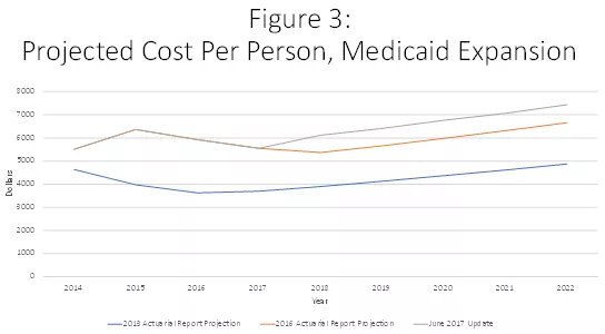 Earlier this month the Centers for Medicare and Medicaid Services (CMS) actuary published a score of the House bill to repeal and replace the Affordable Care Act (ACA). Contained within that score is a concerning update of CMS’s projections for the costs of the ACA’s Medicaid expansion. Incredibly, the latest projections now indicate that per capita expansion costs will remain more than 50% higher, through 2022, than previously projected.