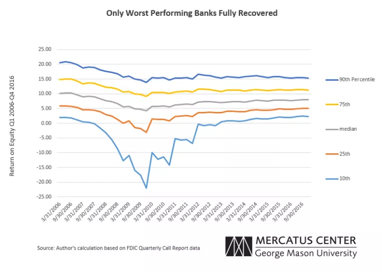 Only the poorest performing banks in Figure 3 have recovered in the sense that the 2016 10th percentile ROEs and ROAs are about equal to the 2006 values, but the values are relatively low. The distribution of outcomes has narrowed since the crisis.
