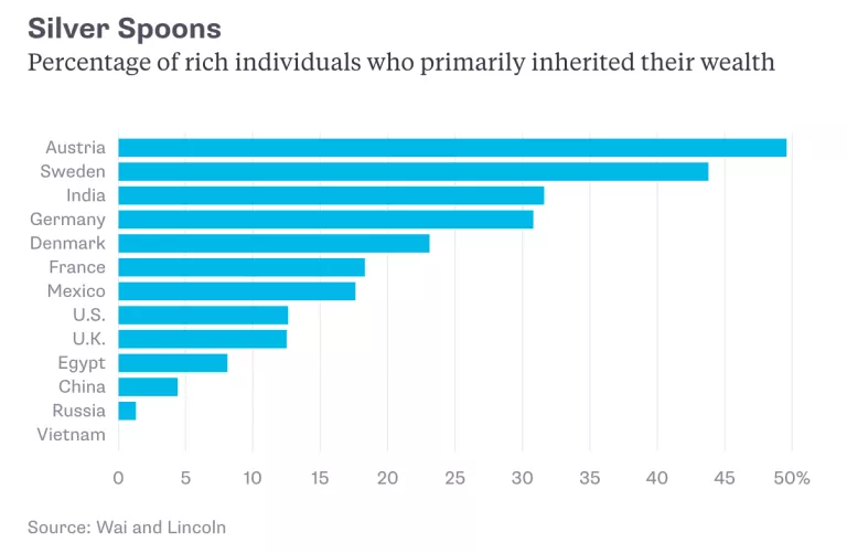 For all the talk of Sweden and Austria as relatively egalitarian societies, they are also the countries where the greatest proportion of high-net-worth individuals inherited their wealth: 43.8 percent and 49.6 percent, respectively. In the U.S., inherited wealth accounts for only 12.6 percent of the very wealthy individuals in the study’s sample.