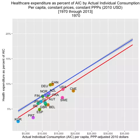 Once we focus on consumption, America’s high health-care expenditures no longer appear so unusual. In fact, if you graph health-care expenditures, per capita, against individual consumption, the fit is very close across developed nations. In other words, the spending bug tracks into health care, too.