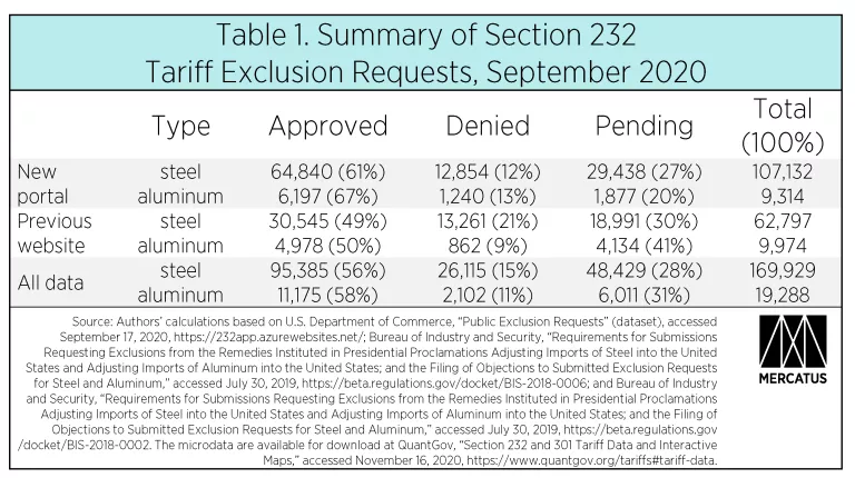 Some exclusion filings are requests for renewals of existing waivers. Since March 2020, approximately 22% of the steel exclusion requests, and 19% of the aluminum exclusion requests, were for renewals on the new portal. (To determine whether a filing was a renewal, we examined the information provided in the cell “Previous BIS.” If the information in that cell included a BIS number, we considered that to be a renewal request.)