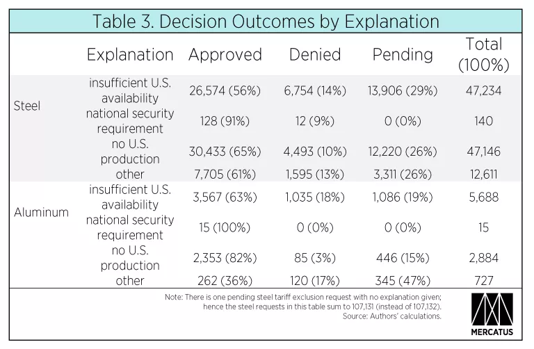 Exclusion requests that claim a national security requirement as an explanation are few in number but have a higher approval rate than those with other explanations: 91% of steel tariff exclusion requests with a national security requirement explanation are approved, and 100% of those for aluminum are approved. However, most requestors cite insufficient or no U.S. production as an explanation.