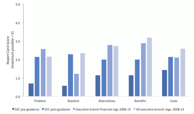 Whether one considers SEC economic analyses or regulatory impact analyses produced by executive branch agencies, there is still significant room for improvement. As the chart shows, for most criteria, the average score is slightly below three points. A score of three points indicates that the analysis includes a conceptual explanation and empirical evidence on some major points, but the fact remains that it is not a comprehensive analysis.