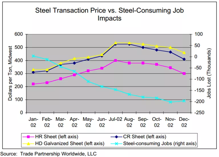 - After the import tax on steel in March 2002, steel prices increased, and more people lost their jobs in steel-consuming sectors than in the entire steel industry.
