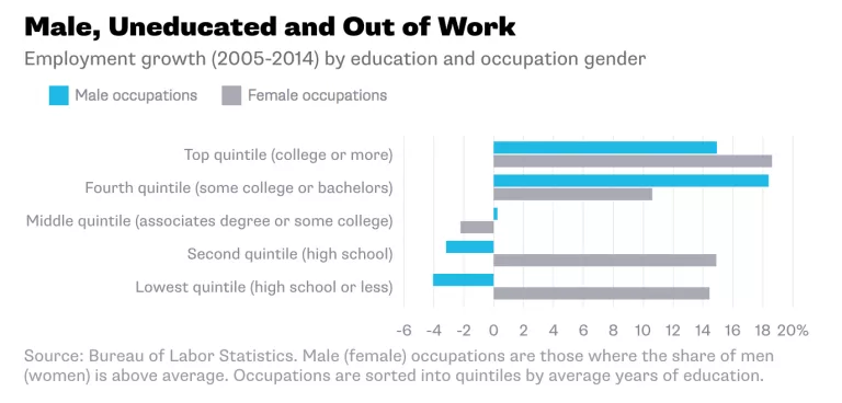 Detailed data suggest that new technologies, which tend to have the largest effect at the lower end of the education spectrum, have been better at replacing men's work. Employment in some predominantly male occupations that require a high-school diploma or less -- such as metalworkers, printing press operators and carpenters -- has declined by more than a quarter since 2005. By contrast, employment in some female occupations with similar requirements -- bakers, manicurists, personal care aides -- has grown by more than a quarter.