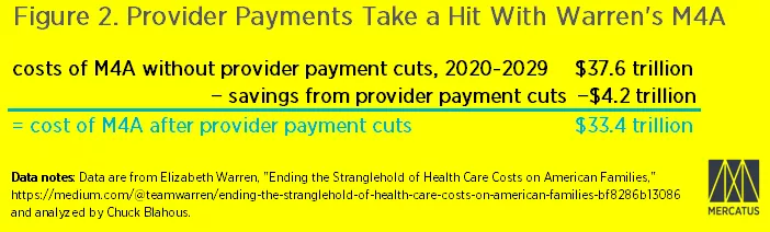 My 2018 paper estimated the costs of M4A at $32.6-$38.0 trillion over 2022-31, depending on how provider payment rates were set. For 2020-29, the years covered in the Warren proposal, this range translates to $29.2-$33.9 trillion. My study, however, was of an earlier bill that lacked a long-term care benefit, unlike Sen. Warren’s plan. Correcting for the inclusion of long-term care produces a range of $32.9-$37.6 trillion. For this piece’s comparison purposes, $37.6 trillion is the best starting place, because the Warren proposal envisions a different provider payment rate structure than the one I analyzed. Only if we use $37.6 trillion as the starting point, can we quantify the amount of savings Sen. Warren aims to generate from provider payment cuts.