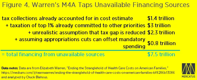 To finance its artificially lowered cost estimate of $20.5 trillion, the Warren proposal names a number of financing sources. For various reasons, several of these are unavailable to provide financing. These include: