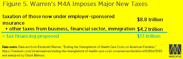 To summarize, the Warren proposal understates M4A’s costs, as quantified by multiple credible studies, by about 34.2 percent. Another 11.2 percent of the cost would be met by cutting payments to health providers such as physicians and hospitals. Approximately 20 percent of the financing is sought by tapping sources that are unavailable for various reasons, for example because she has already committed that funding to other priorities, or because the savings from them was already assumed in the top-line cost estimate. The remaining 34.6 percent would be met by an array of new and previous tax proposals, most of it consisting of new taxes affecting everyone now carrying employer-provided health insurance, including the middle class.