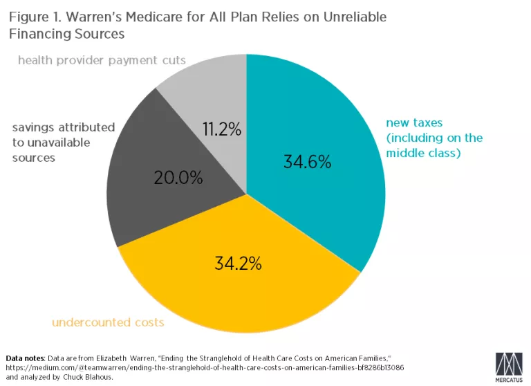 In sum, the Warren framework cannot fully finance Medicare for All because it does not acknowledge most of its costs. Over half of the purported financing is a mirage, consisting of either assuming away the costs (34.2 percent) or tapping financing sources that are unavailable (20 percent). This leaves less than half of the costs to receive realistic financing. Of the lesser portion of M4A that would be realistically financed, the predominant shares would come from taxes shouldered by middle-class workers who currently carry employer-sponsored health insurance, and from steep payment cuts affecting physicians and hospitals.