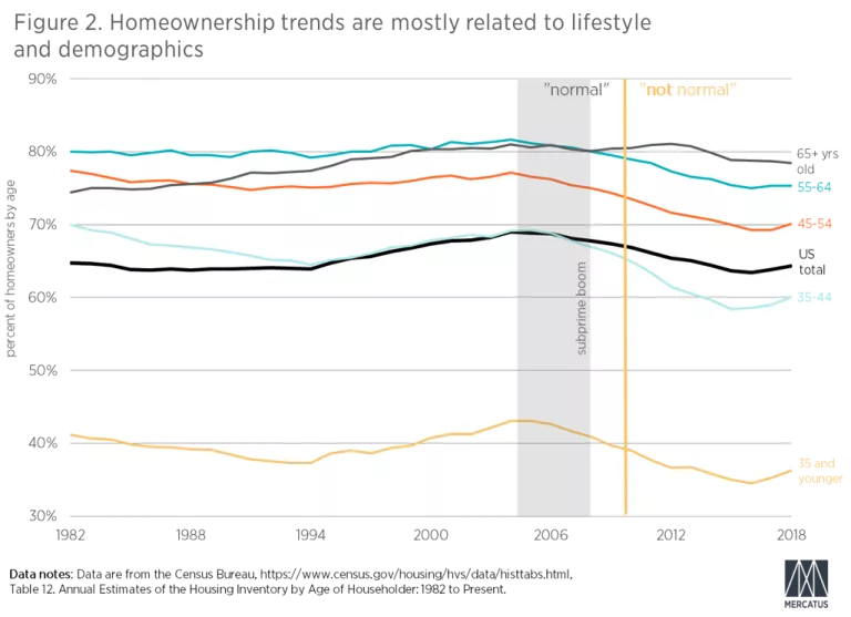 Figure 2 shows the homeownership rate by age group since 1992, the year the Census Bureau started tracking annual estimates. This figure highlights several important points regarding homeownership rates.