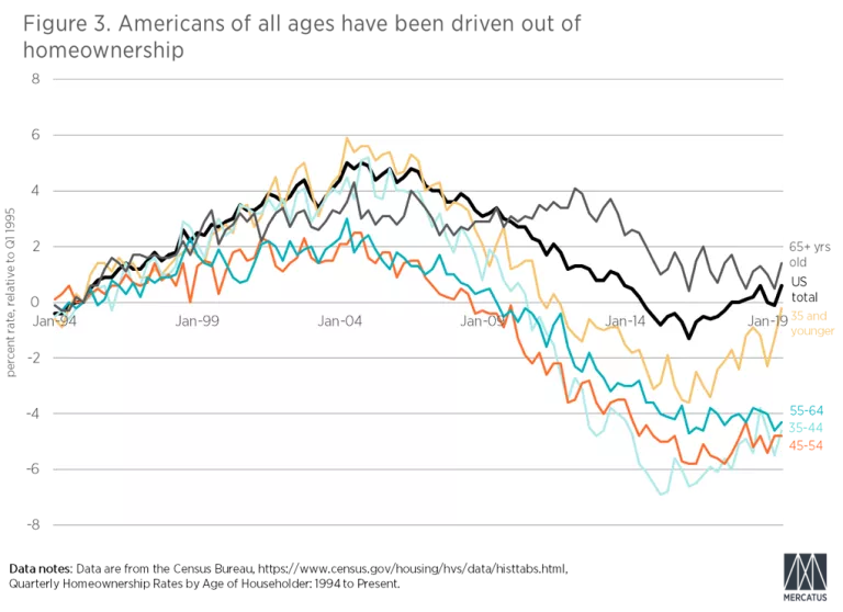 Yet, the other age groups over 35 years of age are faring even worse. They are stuck at homeownership levels similar to the lows of 2016. The housing bust delivered a sucker punch to millions of American households, and many of them are still down. The normal patterns of saving and owning have been disrupted. That is what led to the late decline of ownership for households above 65 years old.