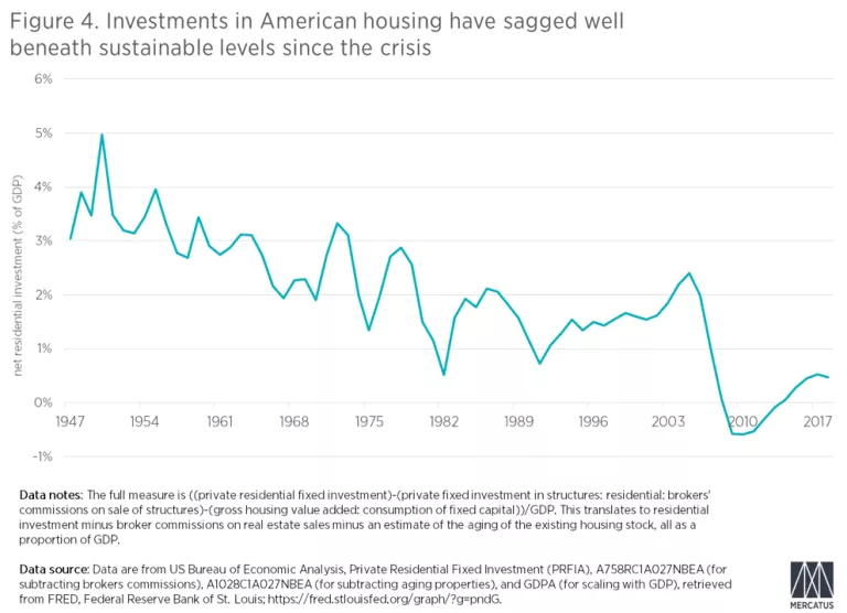 As Figure 4 makes clear, the American housing market has been far below any sustainable level of investment since the crisis. Net residential investment after the depreciation of the existing stock has been stagnant for a decade. More importantly, there never was an unusual surge of investment before the crisis. The rise in residential investment was quite moderate.