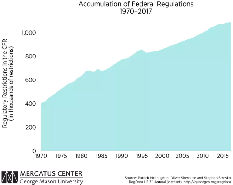 Since Congress first delegated lawmaking authority to regulatory agencies more than a century ago, regulations have steadily grown. The number of regulatory restrictions in the Code of Federal Regulations (CFR), as quantified by RegData, has increased steadily since 1970 (the first year for which we have such data), resulting in 1,085,063 restrictions on the books presently.
