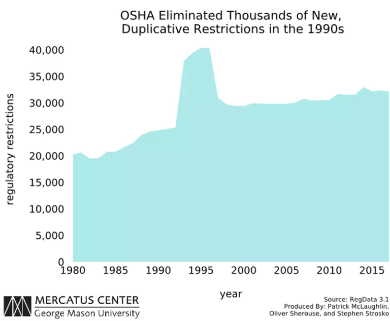 The Occupational Safety and Health Administration (OSHA) was the biggest agency contributor to the National Performance Review’s initiative. From 1995 to 1999, OSHA’s regulatory text in the CFR declined by 11,025 regulatory restrictions.