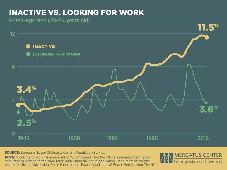 New research published by the Mercatus Center at George Mason University digs into the question of how labor market inactivity has risen over time and which men are inactive. It finds that, contrary to claims made in 2016 by the Obama administration, the rise is not the result of a lack of available jobs or unreasonably low wages. Furthermore, the true unemployment rate is not actually 42 percent (a number that counts retirees and people who are too disabled to work as unemployed), as President Trump suggested on the campaign trail. In fact, the second figure below illustrates government survey findings that only 14 percent of inactive prime-age men say that they want a job. Instead, the problem seems to be one of supply: the men who are inactive simply aren’t motivated to seek employment.