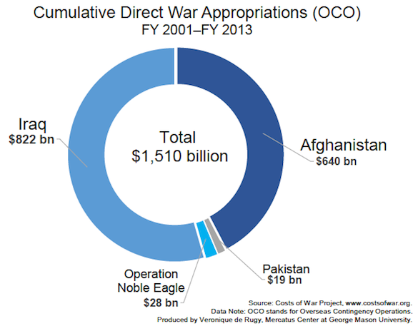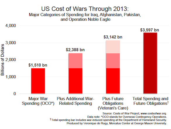 From FY 2001–2013, the United States has spent and taken on obligations to spend in excess of $3.1 trillion on the wars in Iraq, Afghanistan, and Pakistan. The additional war-related spending includes both increases to the DOD base budget (roughly $780 billion) and benefits for veterans (medical, disability, and social security payments, coming to roughly $134 billion). The total costs are higher still when war-induced spending at the Department of Homeland Security and interest due on borrowing to pay for the wars are added to the total.
