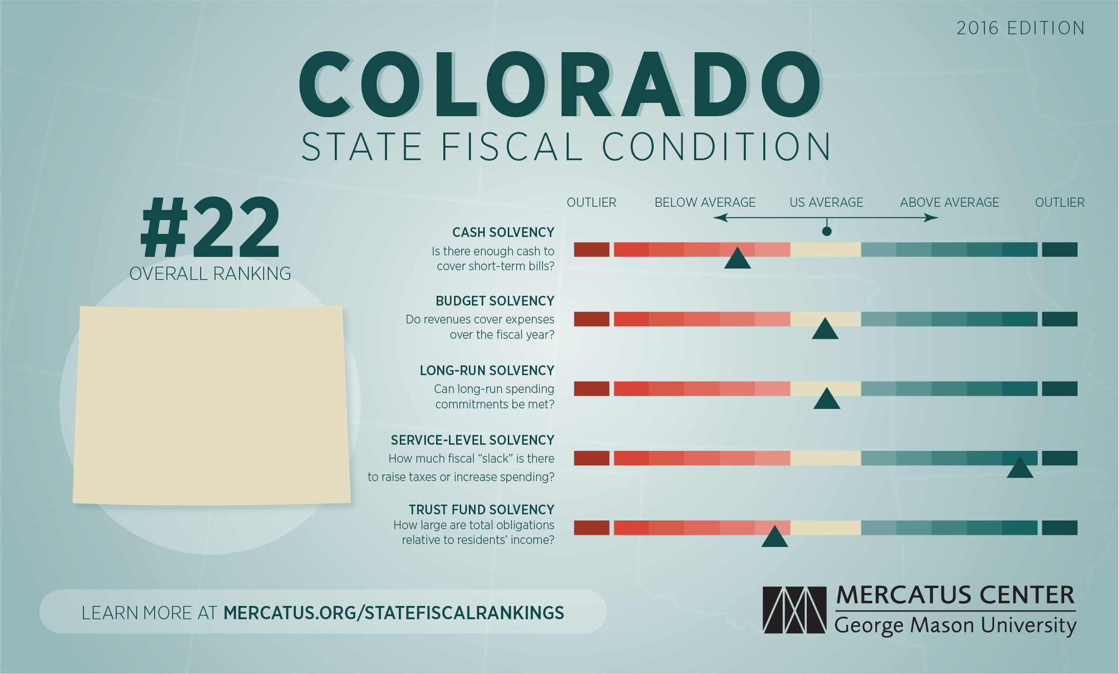 For a complete explanation of the methodology used to calculate Colorado's fiscal health rankings, download the full paper and the dataset at mercatus.org/statefiscalrankings-2016-edition.