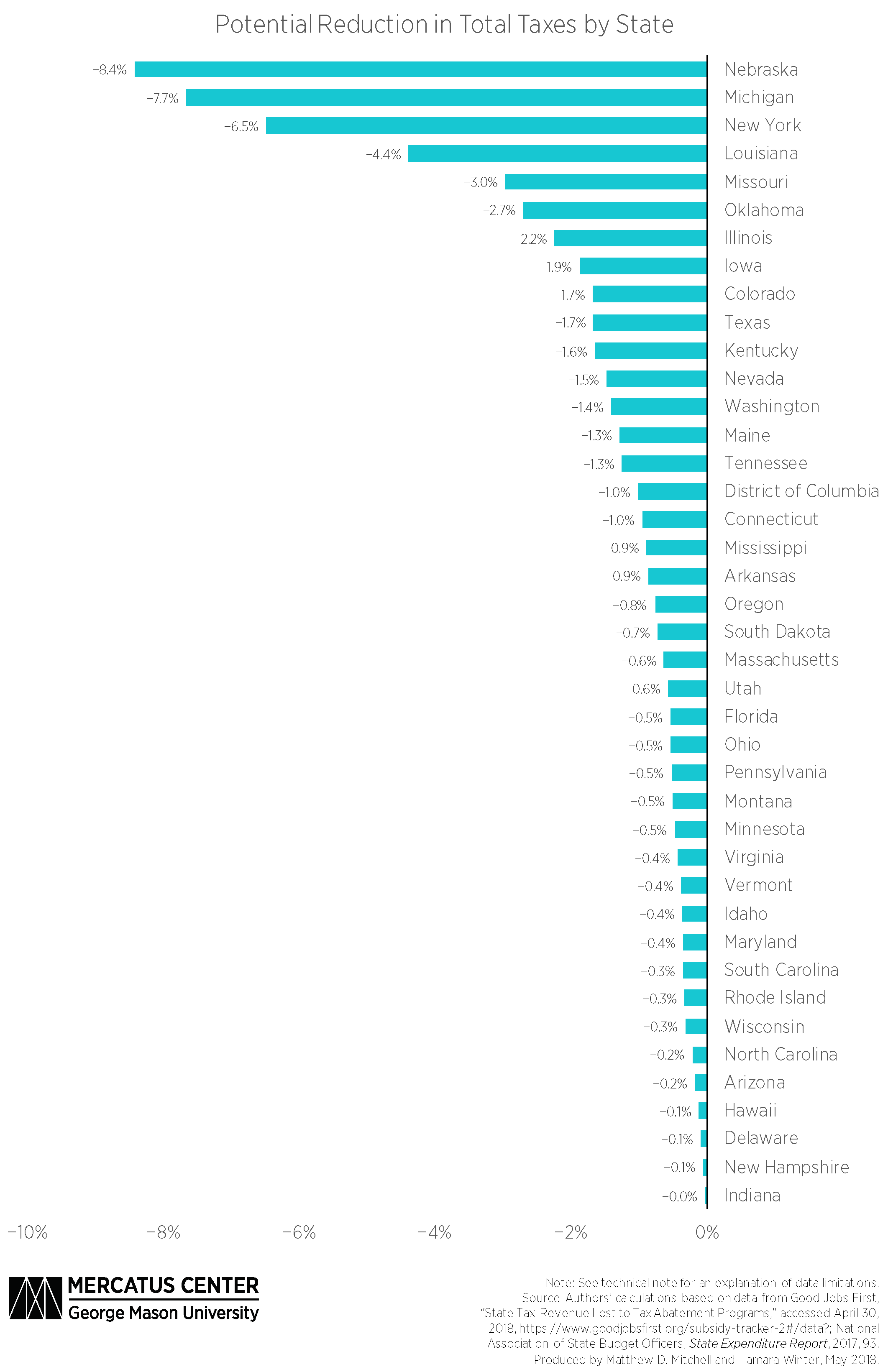- If Nebraska state policymakers eliminated corporate incentives, they could reduce total taxation by 8.43 percent. Similarly, Michigan and New York could reduce total taxation by 7.67 percent and 6.5 percent, respectively.
