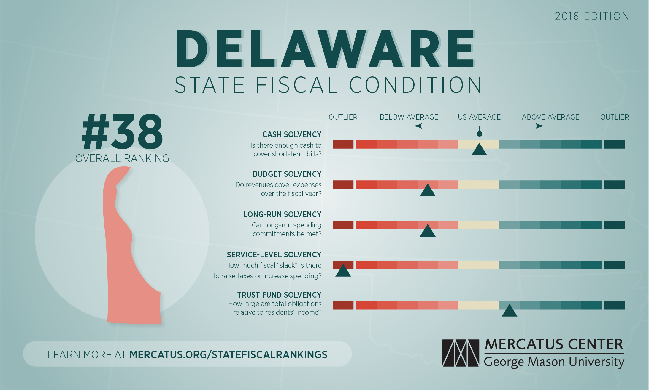 For a complete explanation of the methodology used to calculate Delaware's fiscal health rankings, download the full paper and the dataset at mercatus.org/statefiscalrankings-2016-edition.