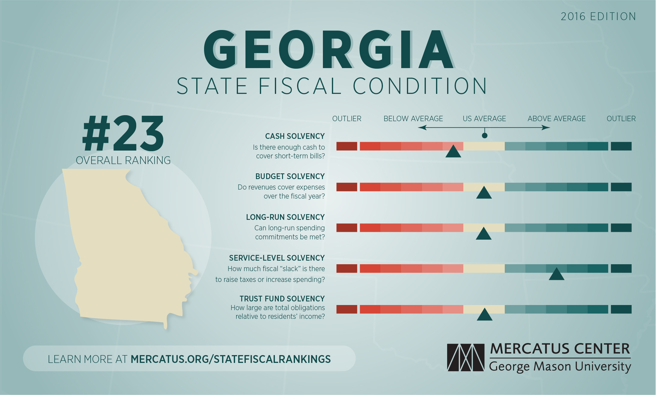 For a complete explanation of the methodology used to calculate Georgia's fiscal health rankings, download the full paper and the dataset at mercatus.org/statefiscalrankings-2016-edition.