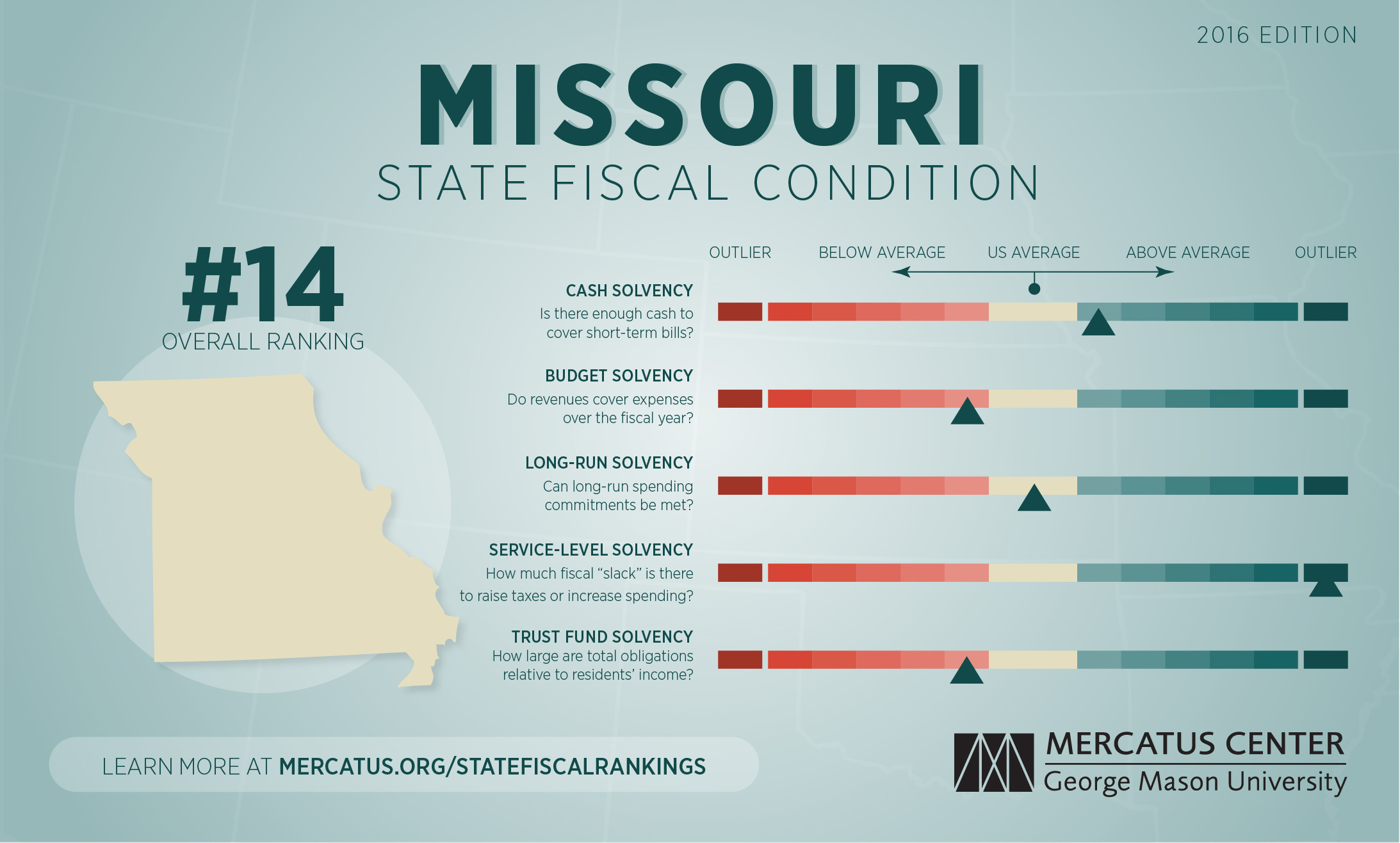 For a complete explanation of the methodology used to calculate Missouri's fiscal health rankings, download the full paper and the dataset at mercatus.org/statefiscalrankings-2016-edition.