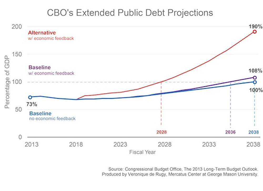 • Baseline scenario: debt held by the public would reach 100 percent of GDP in 2038, 25 years from now, even without accounting for the harmful effects that growing debt would have on the economy.