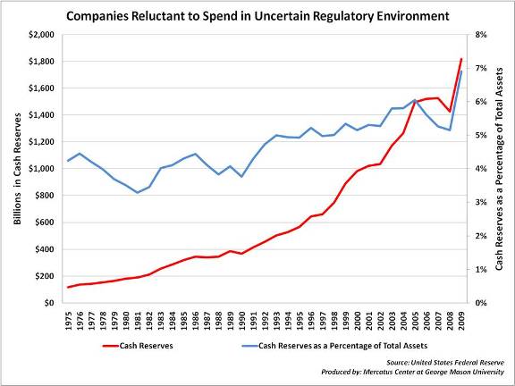 Mercatus Center Senior Research Fellow Veronique de Rugy uses data from the United States Federal Reserve Bank to illustrate one of the greatest economic costs of the current policy environment: lack of business investment. The above chart illustrates billions of dollars in cash reserves held by American companies (red) and these cash reserves as a percentage of their total business assets (blue). By both measures, companies are holding more cash than in 48 years, over 1.8 trillion dollars. Because of an uncertain policy environment these dollars are being held, not spent on machinery, technology or jobs.