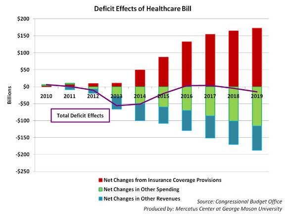 This chart by Mercatus Center Senior Research fellow, Veronique de Rugy examines the deficit effects of the final healthcare legislation using Congressional Budget Office projections.